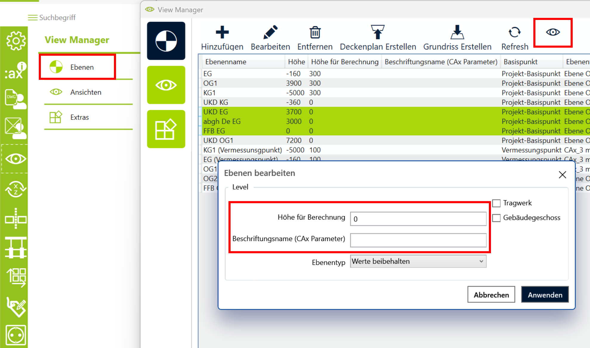 - Die gewählten Ebenen können in einer Ansicht markiert und hervorgehoben werden.