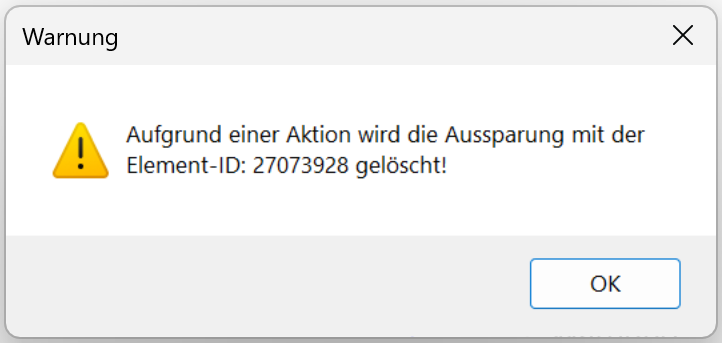 Sobald die Durchbrüche aufgrund von Änderungen im Projekt, wie dem Entfernen der Trassen, gelöscht werden, erscheint eine Meldung zur Information.